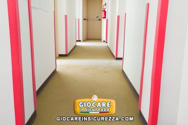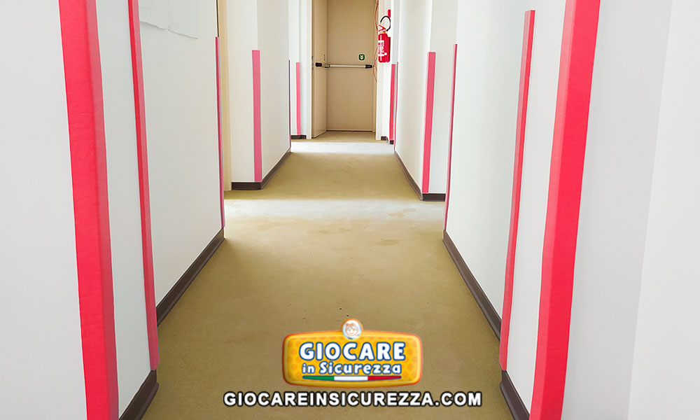 In foto, si può visionare il prodotto “Paraspigolo EvaSoft” di colore giallo, applicato sugli spigoli murali delle colonne di un corridoio di una scuola primaria.