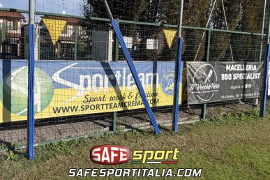 Nella foto è possibile visionare il prodotto TecnoSoft di colore blu, installato contro dei pali situati nell’area perimetrale di gioco di un campo da calcio.